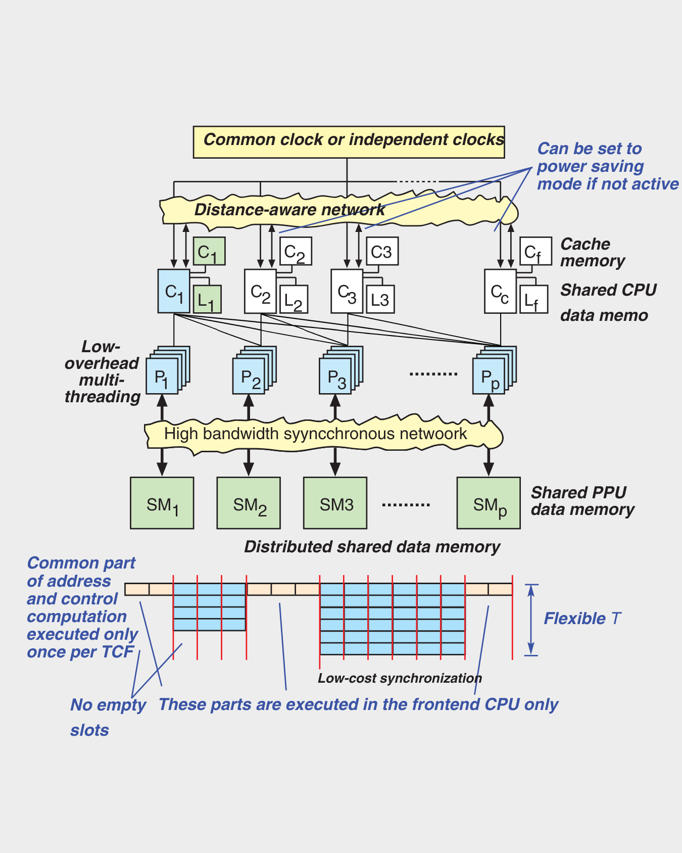 Another advantage is the ability to adjust parallelism according to the needs of the coded algorithm. All this happens by executing other fibers while a fiber is accessing the memory so that even high latencies are tolerated [Forsell22], using the multimesh interconnect, trading slow barrier synchronizations into a synchronization wave that separates the references belonging to consecutive execution steps [Ranade91] and using a CPU to take care of fetching instructions from the memory and executing the common parts of TCFs, such as control of the flow and base address computation and a PPU to handle execution of individual fibers independently of the number of them (see Figure).