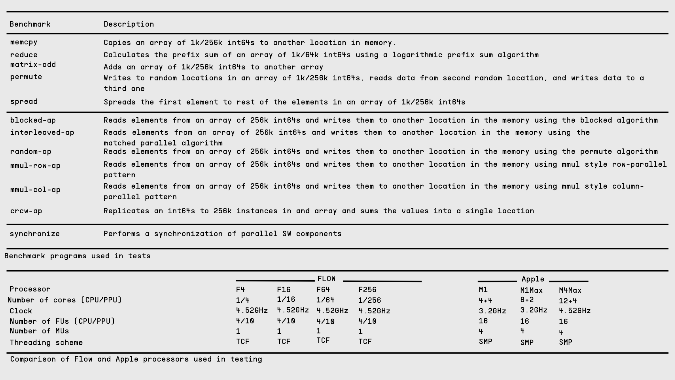 Benchmarks included representative compute- and memory-intensive workloads such as matrix addition, memory-bound access patterns, and synchronization routines implemented as explicitly parallel blocking C/P threads and TCF assembler programs (see Table below). The compared processors include Flow systems with 4, 16, 64 and 256 core Flow PPU and 4+4-core Apple M1, 8+2-core M1 Max and 12+4-core M4 Max (see Table below).