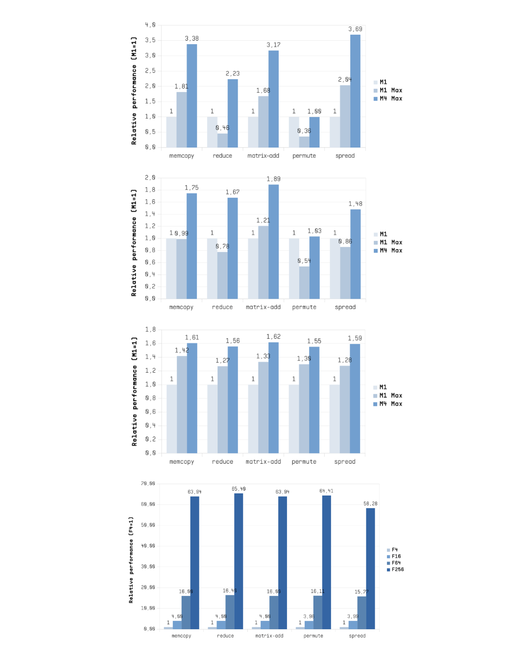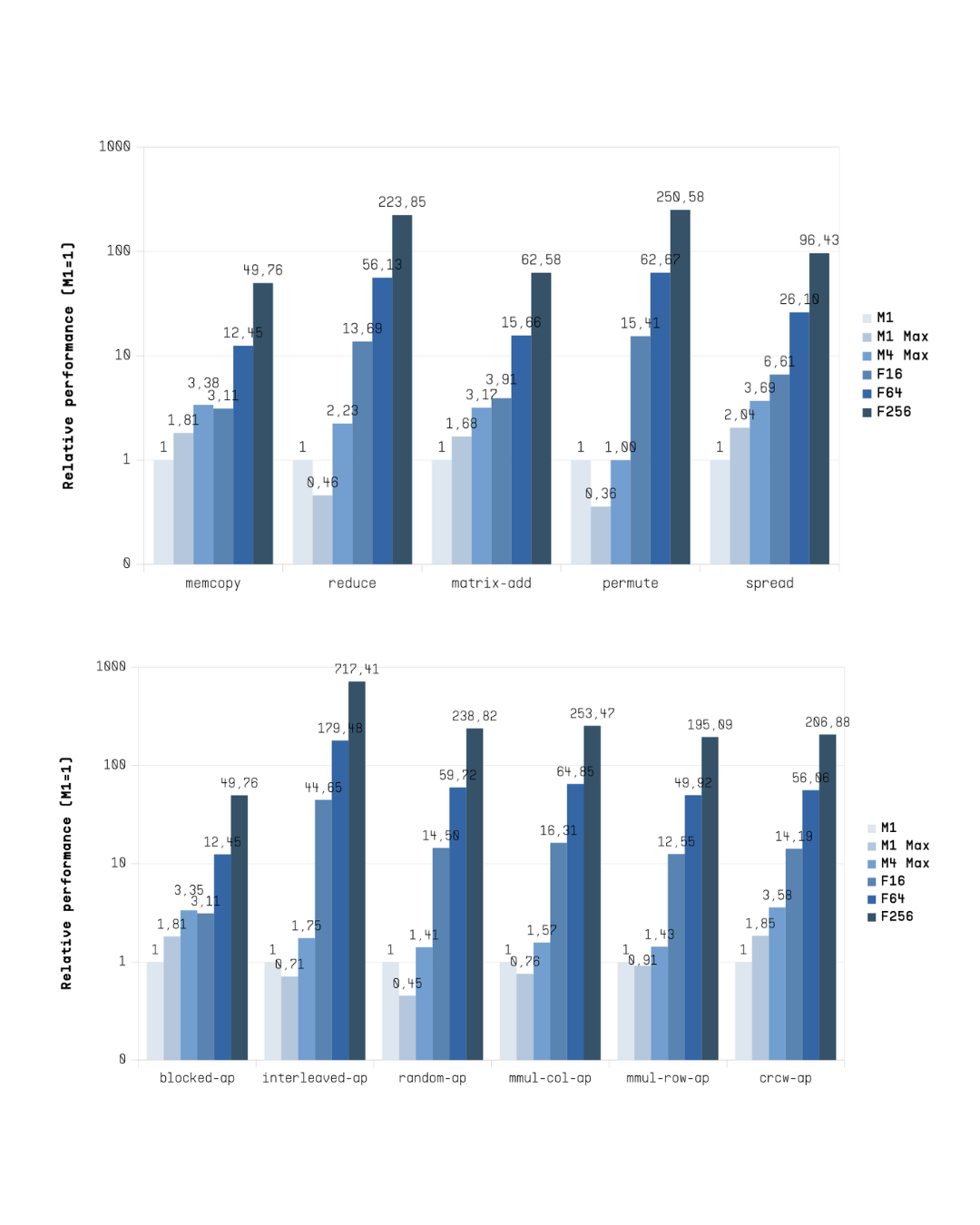 In these benchmarks, Flow’s F256 configuration significantly outperformed Apple’s M-series processors, achieving on average 211x, 221x and 105x higher performance in memory access pattern tests wrt. to M1, M1 Max and M4 Max, respectively. Compute patterns show an average speedups that are roughly half of those measured in the memory access comparison.
