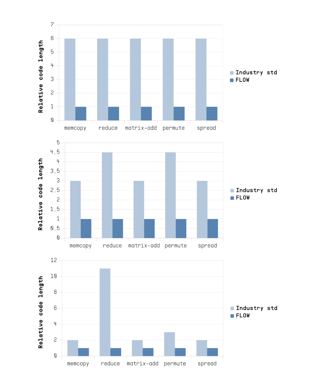 Parallel programming on current CPUs is often complex due to architectural weaknesses that force programmers to use inefficient ways to write algorithms. This has a negative effect on software engineering productivity for parallel workloads. Programming in Flow's systems is simple due to the architecture optimized for efficient parallel computing. In order to figure out what is the practical difference between Flow and the current CPUs, the number of active program lines was determined for the compute pattern tests for included algorithm styles (maximally parallel, matched parallel and blocking).