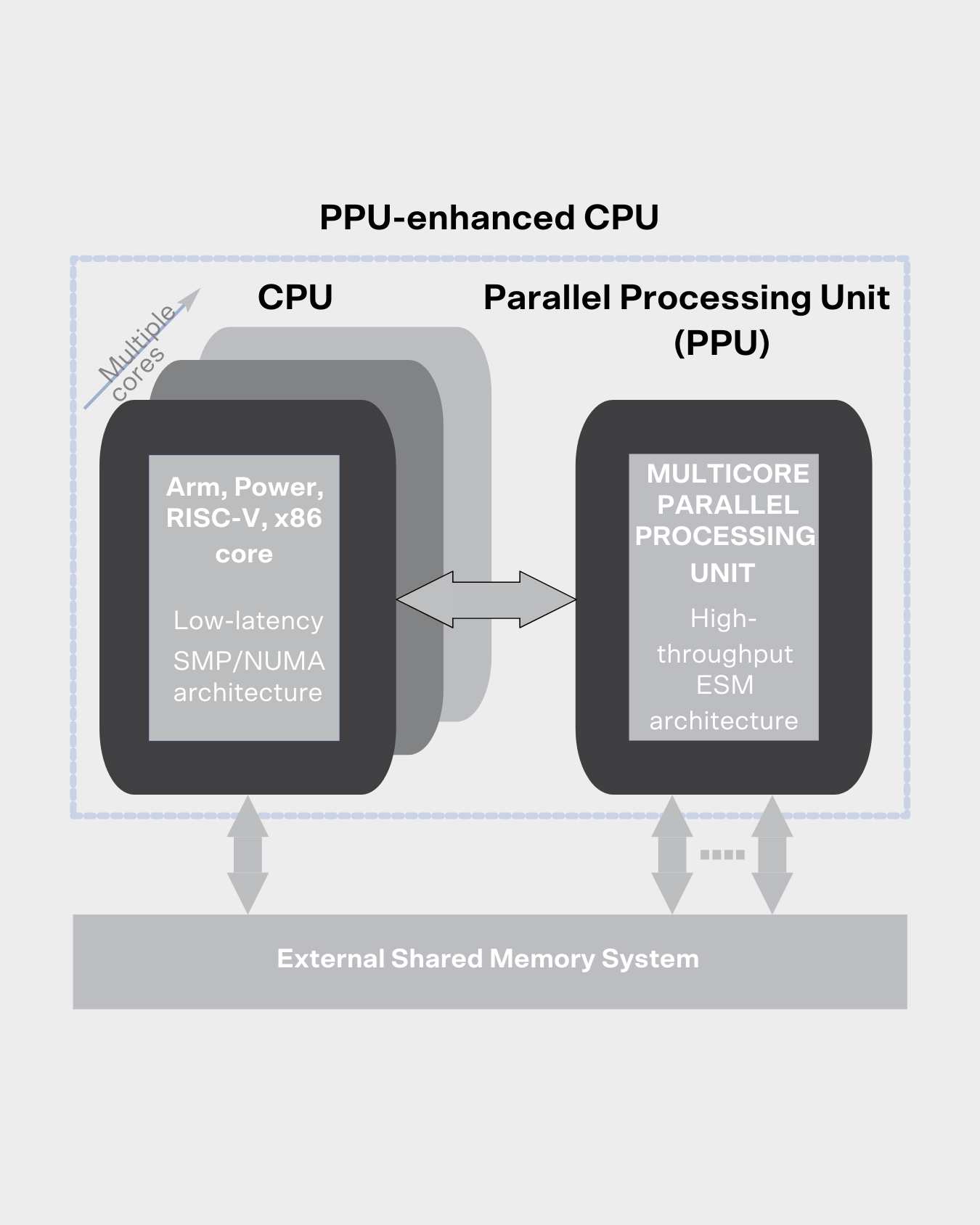 Attempts to solve the problem of early ESM proposals by integrating low-latency and high-throughput executions into a single monolithic architecture indicate that either sequential or parallel execution gets compromised [Forsell18]. Our approach is to integrate dedicated sequential and parallel architectural components into a tightly coupled entity utilizing a Central Processing Unit (CPU) and Flow Parallel Processing Unit (PPU) [Forsell16] (see Figure). In the resulting hybrid architecture, the CPU handles sequential execution, TCF control, and legacy code, while Flow PPU is optimized for high-performance, general-purpose parallel computing, i.e., efficiently executing individual parallel software components. Both architectural units access a unified memory system to allow co-processing, simplify data handling, and minimize the need for explicit synchronization.