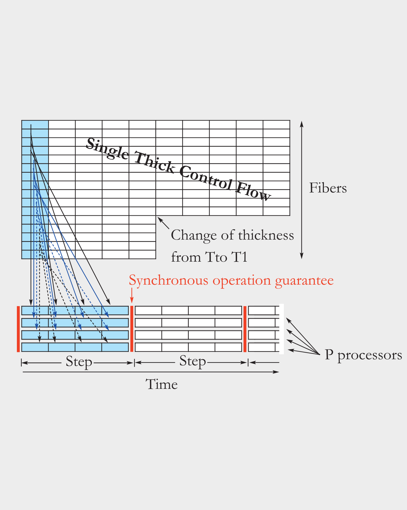 A Thick Control Flow (TCF) is Flow’s programming model designed to streamline parallel task execution [Leppänen11, Forsell13]. It eliminates many of the control-flow inefficiencies seen in traditional pipelines by executing groups of threads (fibers) in a tightly orchestrated fashion. The number of threads, i.e. parallelism, in a TCF is called thickness. Fibers are executed in steps during which all fibers execute a single instruction. A TCF can also be seen as an abstraction that simplifies parallel programming by managing a number of parallel software components with a single control like a vector or thread with data parallelism would do.