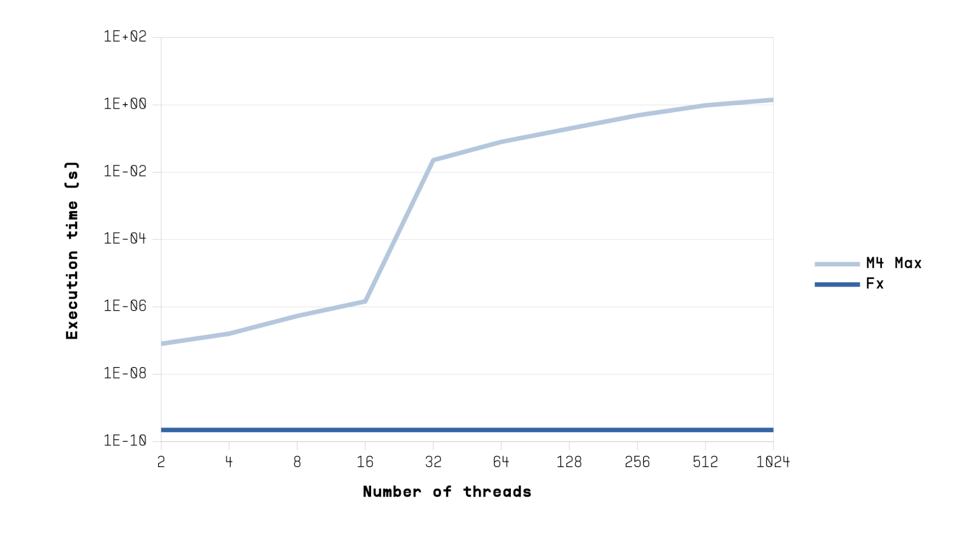 This image shows the measured execution time scaling of matsum and matmul implemented with C/P threads as a function of the number of threads on an Apple M4 Max system compared to ideal scaling of a single threaded execution.